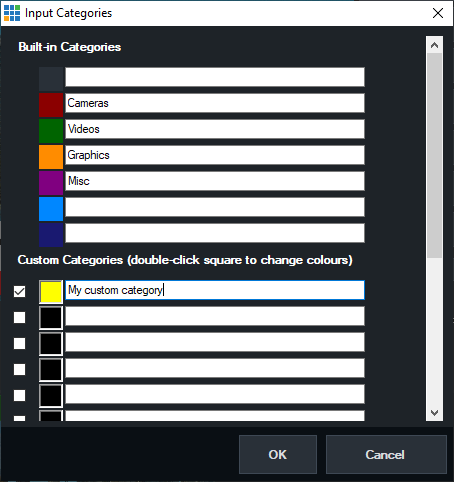 To enable a custom category, tick the box next to it. To select the colour for a custom category, double click the colour box next to the checkbox.